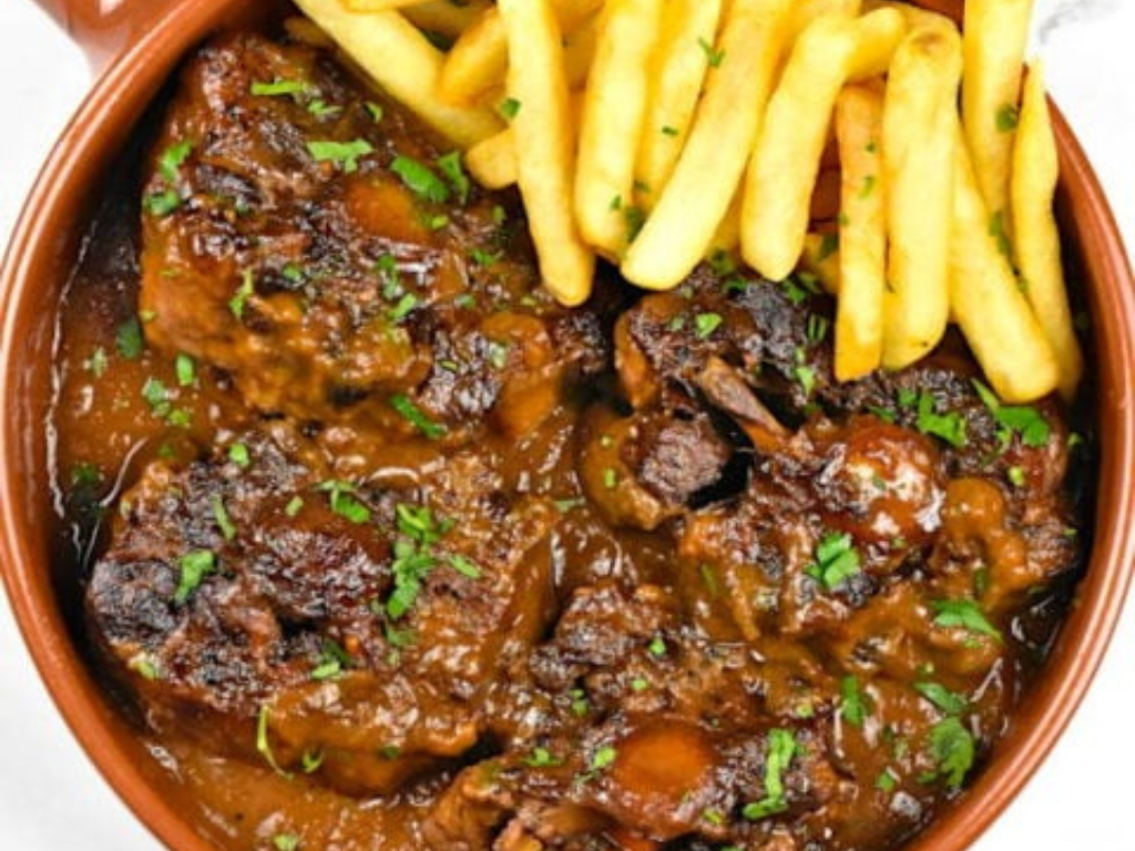 Rabo de toro al estilo tradicional con salsa y patatas fritas.